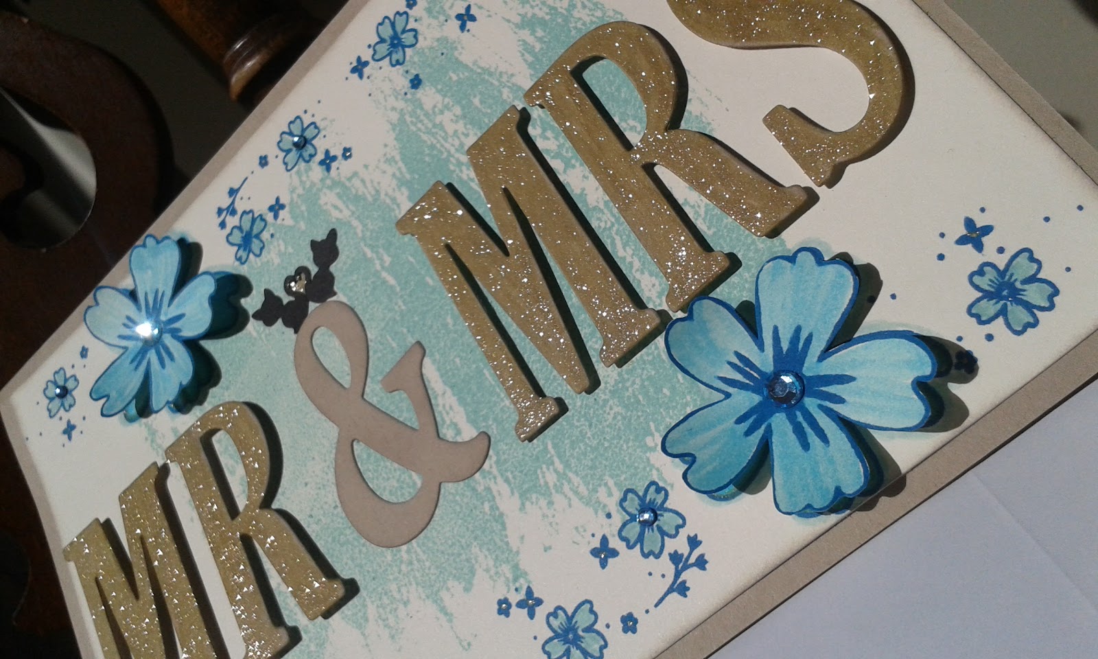 I was commissioned to create a glitzy wedding card for a friend. I chose a crumb cake cardstock base, stamped Mixed Boarders in Pacific point ink, and coloured all the flowers in with Tempting Turquoise all stamped onto Very Vanilla card stock. The larger flowers, that I cut out, come from the stamp set Love & Affection. I raised them up on Stampin Up dimensionals and added a diamante in the middle of the flowers, to give the card that extra sparkle. I used the Large Letters Framelits for the lettering and finished it off with Wink of Stella (Gold).